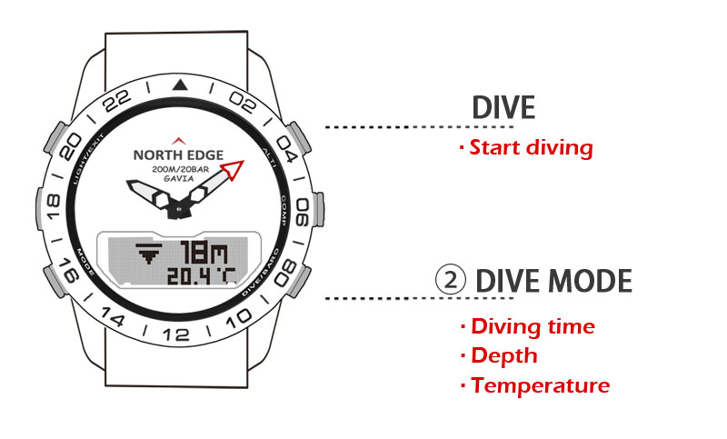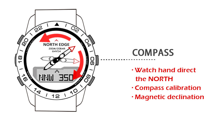 Altimeter/Barometer/Compass/Diving/Waterproof 200M/Dual Time/Count Down/Calories/Time Alarm/ Temperature/ Back-lit/ Low power reminder/ Pedometer/ Low temperature resistant
