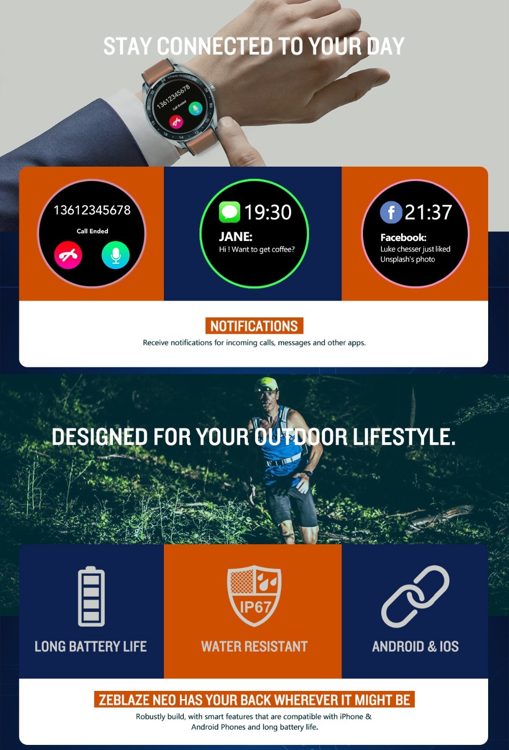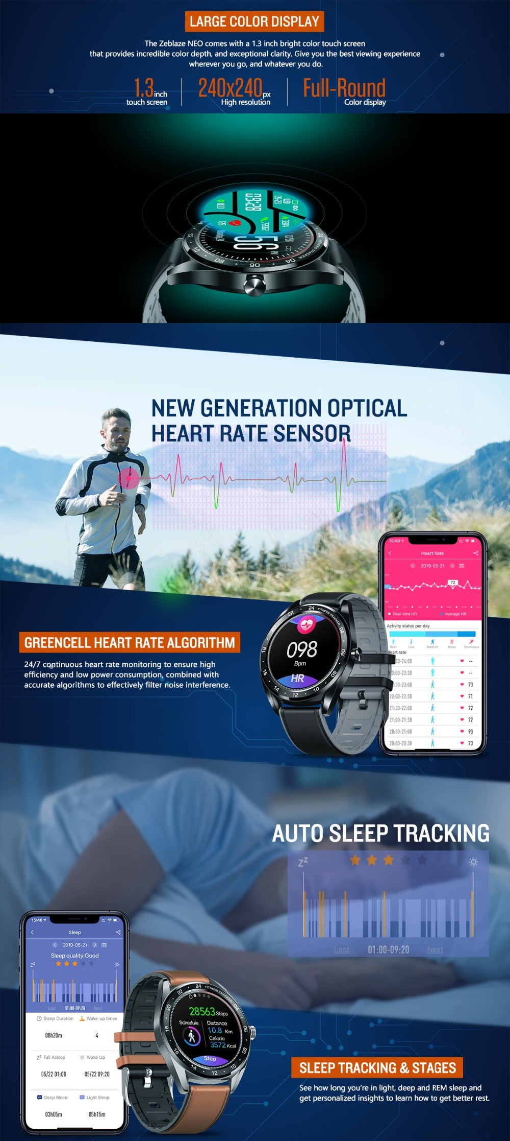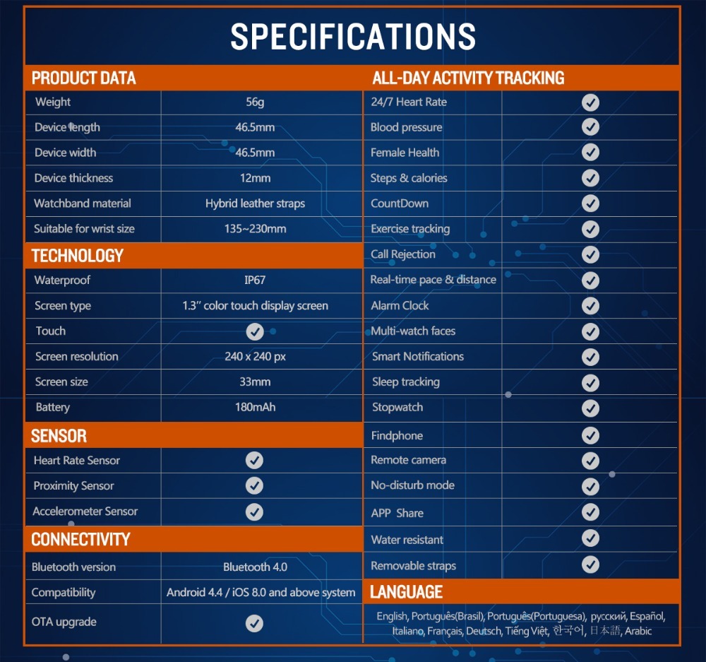 Standout Features: 24/7 Heart Rate, Blood Pressure, Steps & calories, CountDown, Female health, Call rejection, Exercise tracking, Real-time pace & distance, Smartphone Notifications, Sleep tracking, Stopwatch, Findphone, Alarm clock, Multi-watch faces.