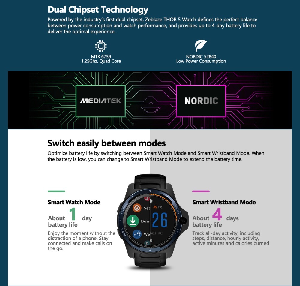 CPU: MTK6739, 1.25Ghz, Quad Core + Nordic 52840 (Dual Chipset Technology)