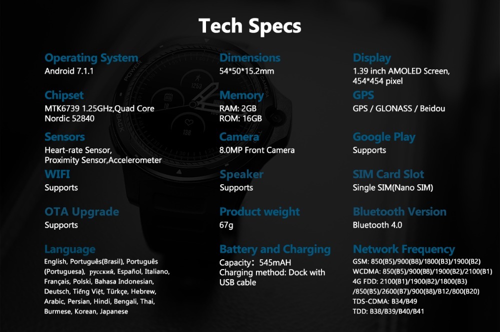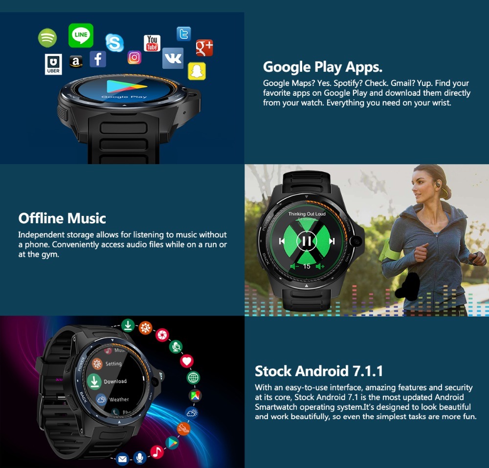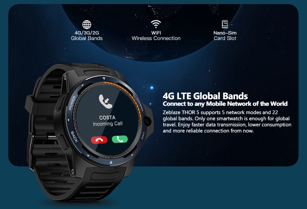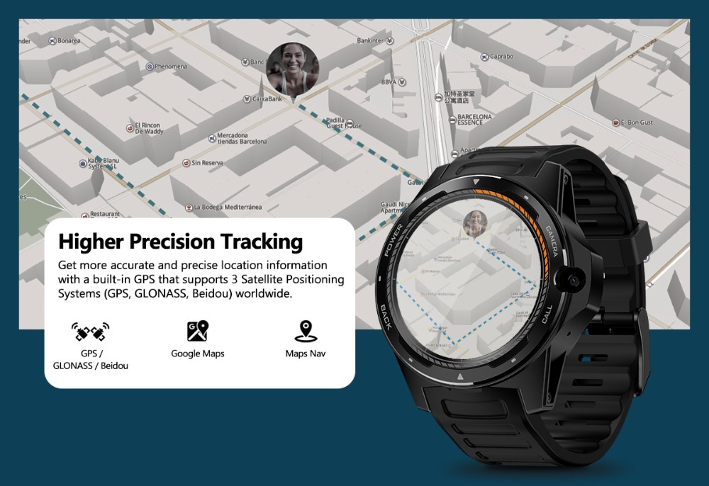 Functions: 4G Network(Global Bands), GPS/GLONASS/Beidou, Google Play, Voice Search, Offline Music,WiFi, Weather, Clock Faces for Any Occasion, Apps, Clock faces & Notifications, Phonebook, Alarm, Bluetooth, Browser, Calendar, Camera, E-book, MP3, MP4, Heart rate monitor,Pedometer, Call Reminder, Message Notification, Answer Call, Dial Call.